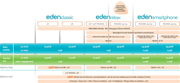 Seules deux versions des forfaits Eden relax sont conservées, les autres voient leurs tarifs baisser. L'Eden relax 2h + 3 n° illimités passent de 32,90 €/mois à 29,90 €/mois et son fair-use est augmenté de 350 à 500 Mo. L'Eden relax illimité 24/24 devient une série limitée jusqu'au 17 juin pour 200.000 clients et voit son prix baisser de 44,90 €/mois à 39,90 €/mois.euros.