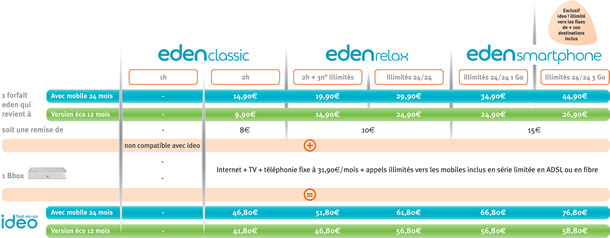 Du fait des baisses de prix sur les forfaits Eden (voir ci-dessous), les offres Ideo baissent en conséquence, de 46,80 €/mois avec un Eden classic 2h jusqu'à 76,80 €/mois avec un Eden smartphone illimité 24/24 et fair-use de 3 Go. Ce dernier comprend également les appels illimités vers les fixes de plus de 100 destinations.