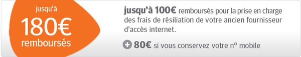 Pour les nouveaux abonnés, l'offre de remboursement des frais de résiliation de votre ancien fournisseur d'accès Internet est désormais de 100 €, cumulable avec les 80 € de remboursement supplémentaire si vous prenez un forfait mobile ideo et que vous conservez votre numéro de mobile.