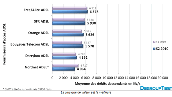Les accès ADSL testés pour obtenir ces chiffres étaient à 7 % chez Bouygues Telecom, une proportion évidemment moindre que pour la fibre. Rappelons que Bouygues Telecom ne s'est lancé dans l'accès Internet par ADSL que fin octobre 2008.