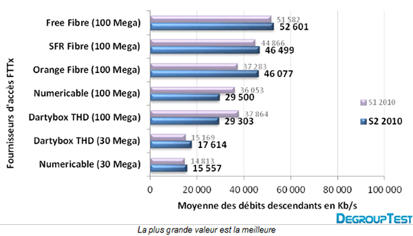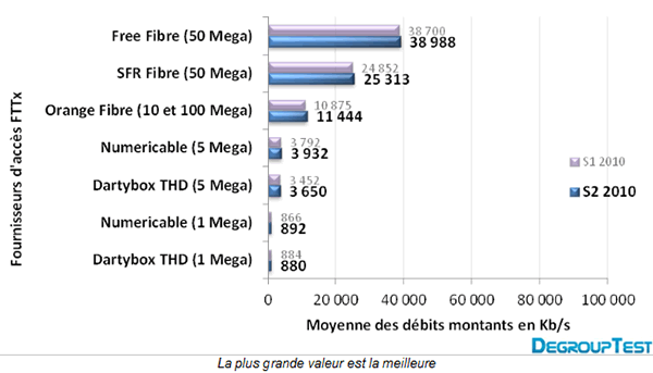 Si pour la Fibre optique l'opérateur n'y apparait nommément, nous pouvons nous fier aux résultats obtenus par Numericable, la Bbox Fibre utilisant son réseau. Comme le précise DegroupTest, il faut relativiser les chiffres obtenus : "Les connexions FTTx (FTTH et FTTLA) offrent des débits bien supérieurs à ce que propose l’ADSL mais les moyennes récoltées montrent des performances en deçà de ce que permettent ces technologies. Cela n’est pas forcément dû aux réseaux mais plutôt à l’équipement des usagers. En effet, les différents éléments (système d’exploitation, cartes réseau, liaisons sans fil en Wi-Fi...) peuvent limiter les performances de la connexion alors que le réseau est pleinement opérationnel."